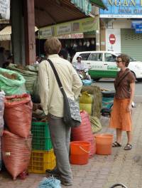 Bardzo mało jest sklepów z jedzeniem, nie widać żadnej sieci typu 7/11, tak popularnej w Bangkoku i Hongkongu. W tym centrum nie widzimy żadnych centrów handlowych ani supermarketów. Oczywiście jest ogromny "market centralny", z mnóstwem malutkich stoisk, ale on jest w dużej części nastawiony na obsługę turystów. W kraju, który w nazwie ma słowa "socjalistyczna republika", ten brak centrów handlowych bardzo nie dziwi. Władza nad zaopatrywaniem ludności w jedzenie, planowanie braków i niedostatków, to jedna z podstawowych cech tego systemu. Jednak rzeczywistość jest nieco bardziej skomplikowana -- w chińskiej dzielnicy znajdujemy w końcu coś, co wygląda na nowoczesne centrum handlowe. Ale omijamy je szerokim łukiem i idziemy odkrywać ulicę motocyklową.